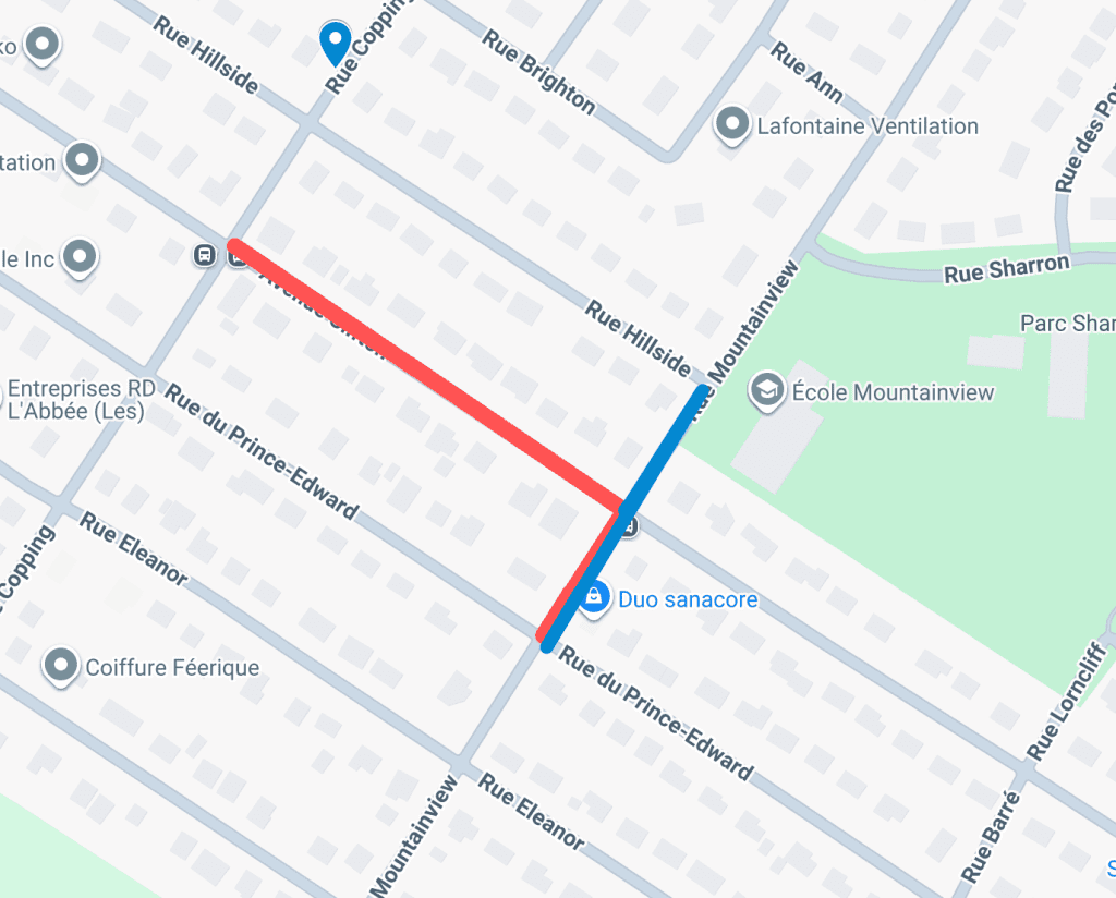 La ligne rouge fait référence à la fermeture de rue à prévoir demain matin, le temps de la réparation. Toutefois, notre personnel accommodera les autobus et piétons. Enfin, la ligne bleu indique l’endroit où se situe la conduite à réparer.
