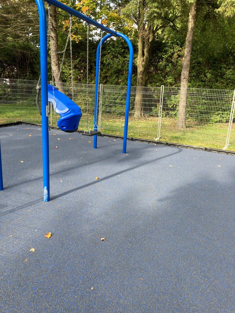 Les préposés des travaux publics ont récemment installé un sol caoutchouté sous les balançoires, offrant ainsi une meilleure protection et un accès facilité pour les personnes à mobilité réduite.