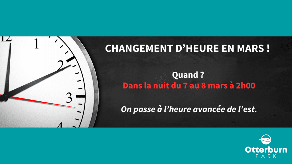 Dans la nuit du samedi 7 mars au dimanche 8 mars, à 2 h, nous passerons à l’heure avancée de l’Est. Il faudra avancer l’heure d’une heure.
